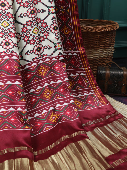PATOLA IKKAT MAROON & OFFWHITE PRINT SAREE WITH HATHI BANARASI PALLU