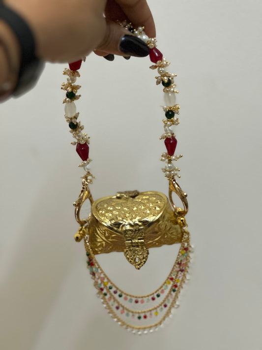 Regular price Rs. 1,500.00Regular priceUnit price / perSale price Rs. 1,500.00A true statement accessory, this handcrafted mini potli clutch shines with royal charm and traditional artistry. The gold-toned metal body features intricate embossed detailing, highlighted with red enamel accents. The handle is beautifully adorned with premium pearls, red beads, and floral gold elements—making it as elegant to carry as it is to admire. Perfect for weddings, sangeet nights, festive occasions, and bridal trousseau styling,... -