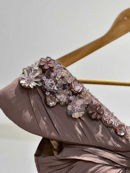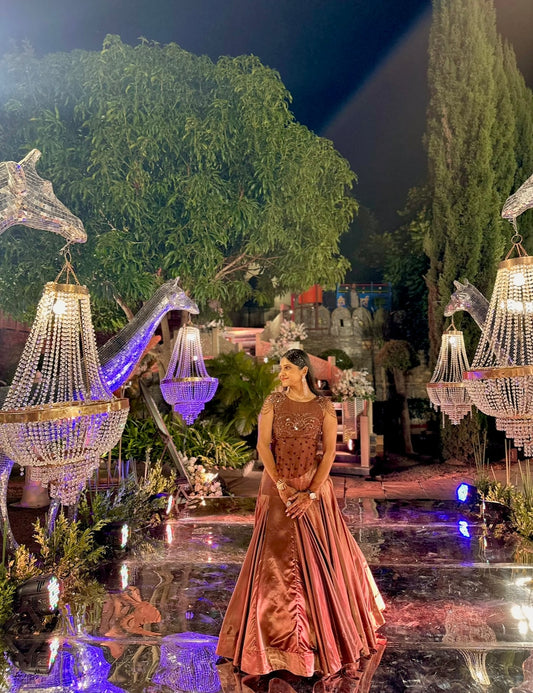 Regular price Rs. 20,000.00Regular priceUnit price / perSale price Rs. 20,000.00Step into timeless elegance with this bronze satin lehenga, designed to capture light with every twirl. The ensemble features a structured, high-shine flare that moves gracefully, creating a mesmerizing silhouette for evening celebrations. The corset is intricately embellished with hand-detailed motifs and delicate shimmer work, adding a touch of luxury while keeping the look effortlessly regal. Perfect for sangeets, receptions, and grand festivities, this outfit...Mocha -