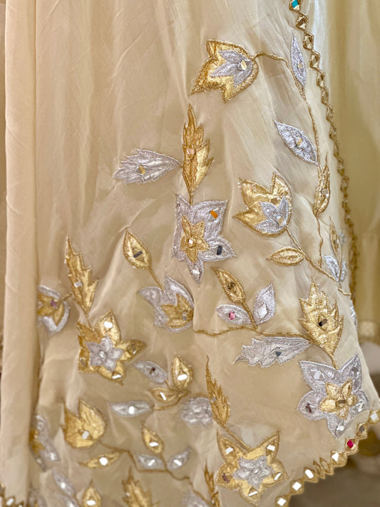 Regular price Rs. 16,499.00Regular priceUnit price / perSale price Rs. 16,499.00Featuring a luxe ivory Anarkali highlighted with mirror detailing on the neckline and sleeves, paired with an intricately embroidered dupatta in gold and silver motifs. This handcrafted set blends subtle shine with timeless charm perfect for festive occasions and elegant gatherings. -