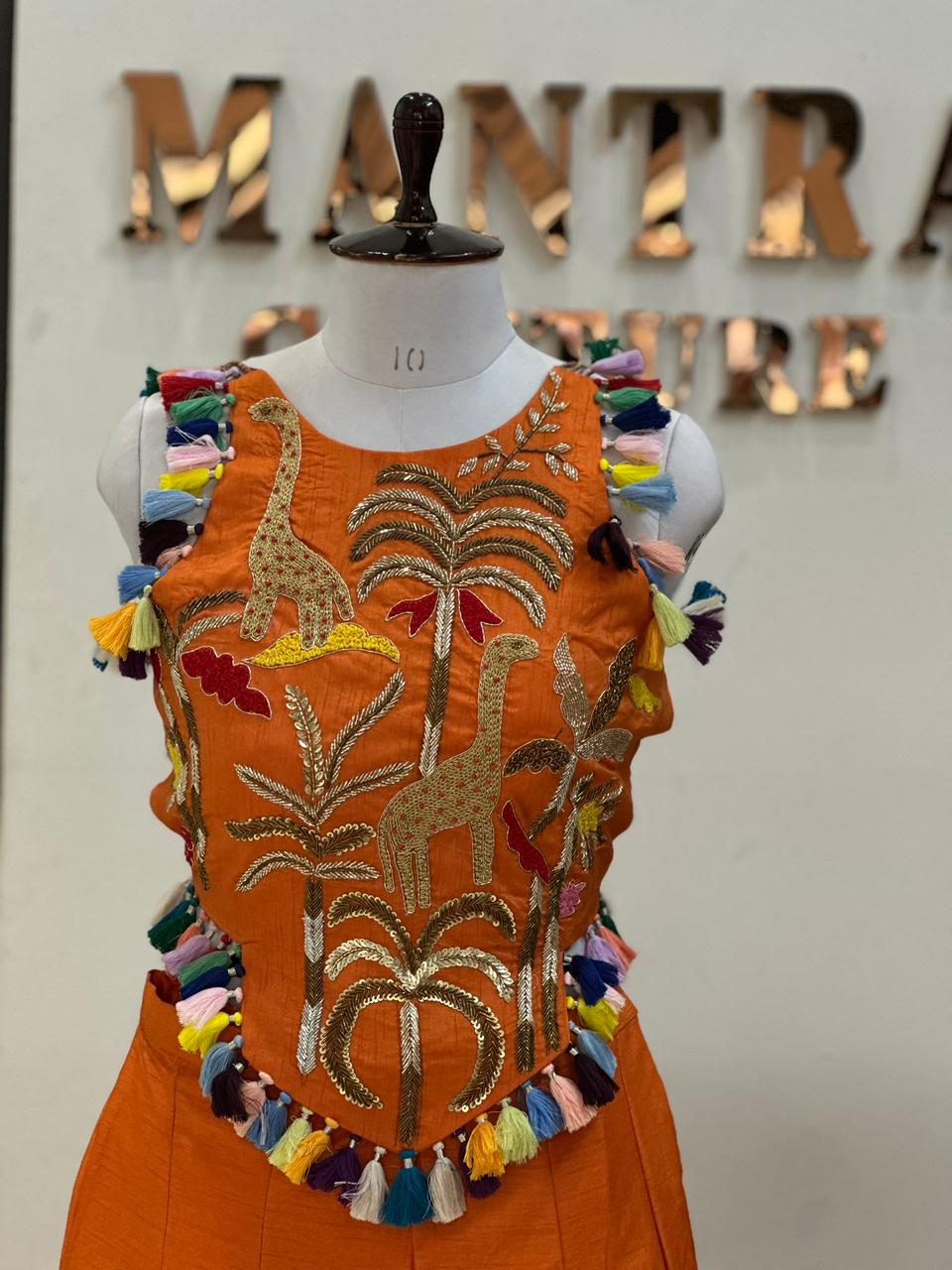 • Experience the vibrant beauty of traditional Indian craftsmanship with our stunning Mantra Embroidered Maxi Dress. This exquisite orange dress features intricate golden embroidery depicting palm trees, peacocks, and floral motifs that celebrate the rich heritage of Indian artistry.