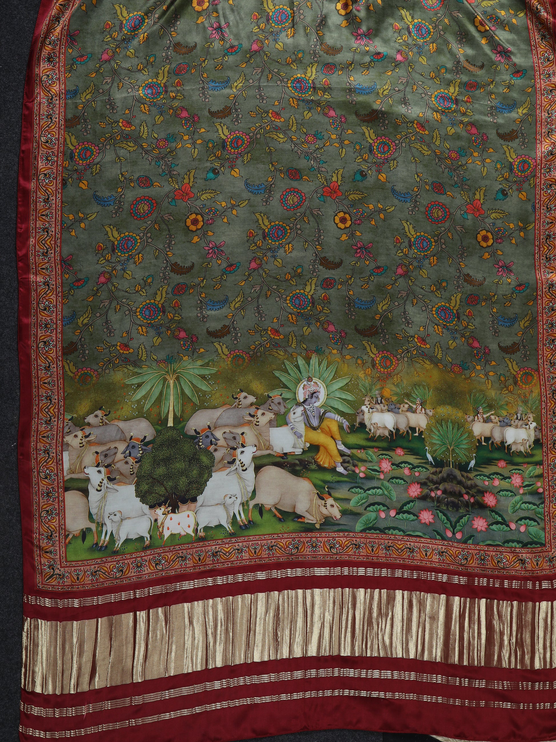 Beautiful Pichwai KrishnaArtwith Kalamkari in Maroon & Green Color Dupatta