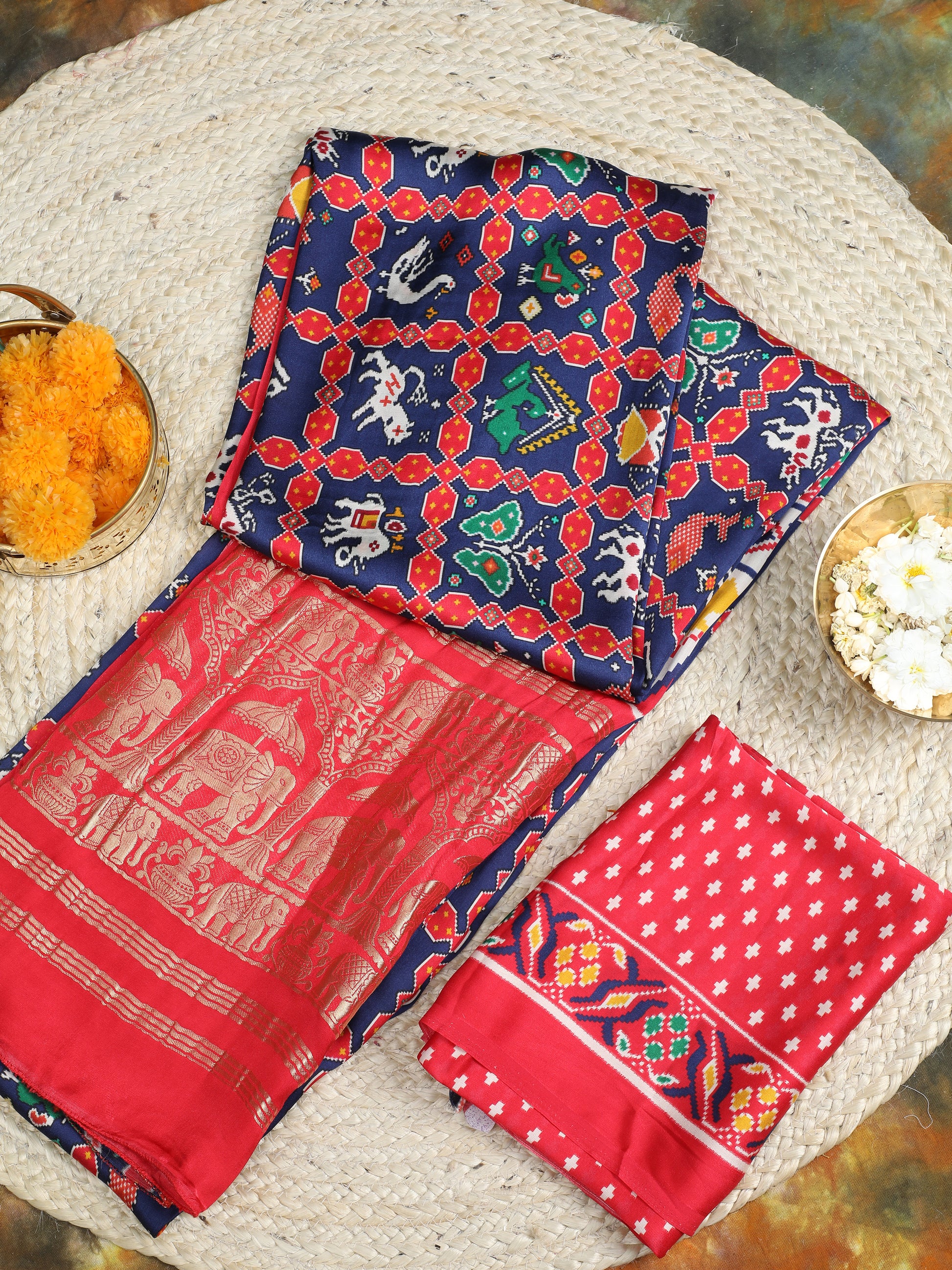 RED & BLUE DOUBLE IKKAT SAREE WITH TISSUE PALLU WITH BLOUSE