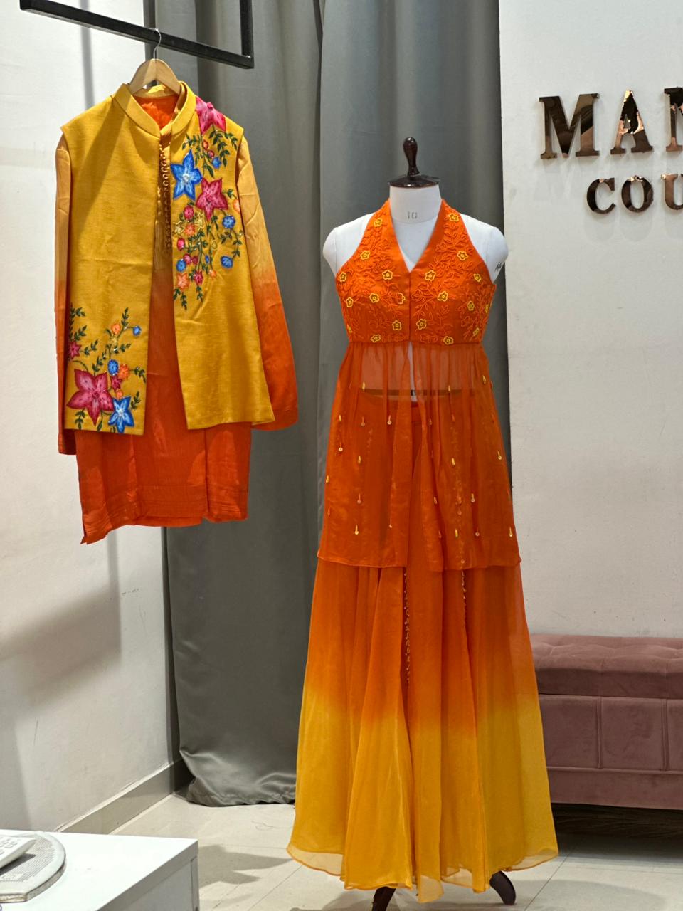 • Embrace the warmth of a golden sunset with our enchanting Surya Sunset Gradient Halter Dress. This breathtaking piece captures the essence of a beautiful Indian evening with its stunning orange-to-yellow ombre effect and intricate floral embroidery.
